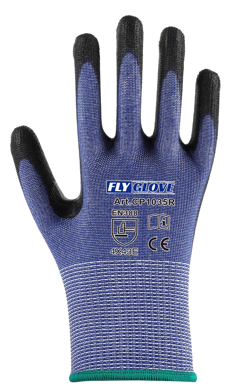 13G Cut E liner, PU palm coating, thumb crotch reinforced.
